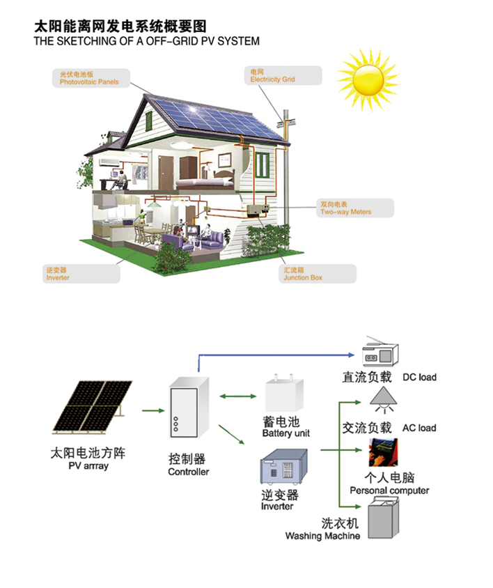 太陽能離網(wǎng)發(fā)電系統(tǒng)由太陽能電池板、太陽能控制器、蓄電池(組)組成。如輸出電源為220V或110V,還需要配置逆變器,各部分的作用為: