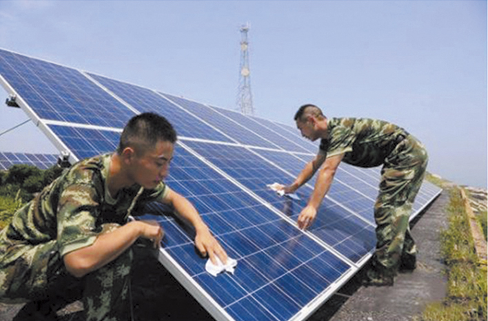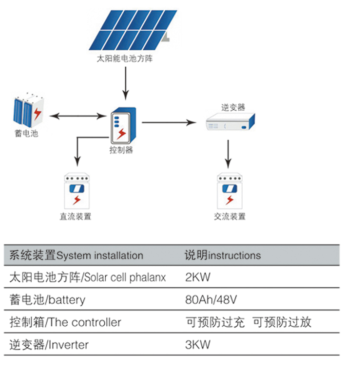 白天通過太陽電池方陣發(fā)的電儲存在蓄電池電池中,滿足軍隊營區(qū)生活照明和辦公設(shè)施使用。
